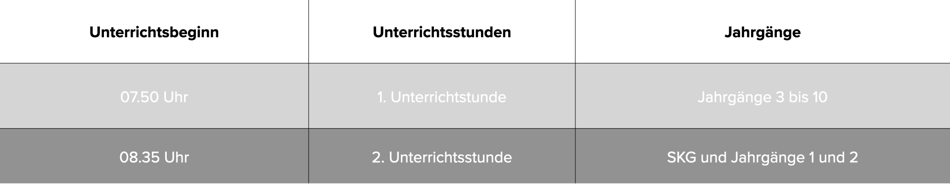 Für den Schulkindergarten (SKG) und die Schuljahrgänge eins und zwei beginnt der Unterricht um 08.35 Uhr. Für alle anderen Jahrgänge (3 bis 10) bginnt der Unterricht um 07.50 Uhr.